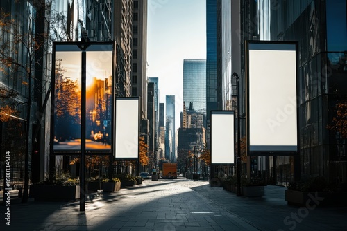 City street with billboards on poles. The billboards are lit up and are advertising something. City roll up banners for commercial ad on the streets.