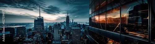 Cityscape at dawn reflecting on skyscraper windows. Stunning urban skyline panorama with dramatic clouds and ambient light.
