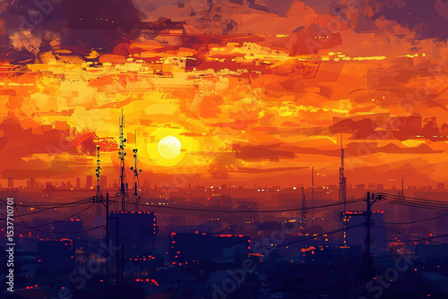 Cityscape at Sunset: An artistic rendering of the urban landscape under warm sunset colors