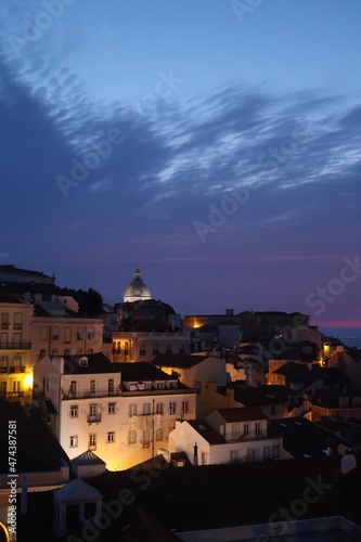 Cityscape Image of Lisbon, Portugal during dramatic sunrise.