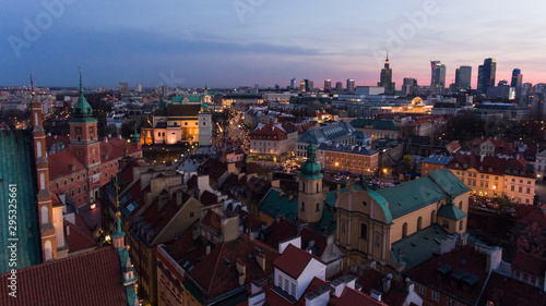 Cityscape of old buildings and architecture in the old town in Warsaw. Aerial view of old buildings, castles and a church in the old city of Warsaw.