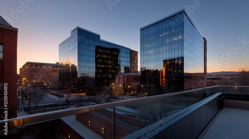 Cityscape sunrise view, modern glass buildings, urban landscape, rooftop balcony