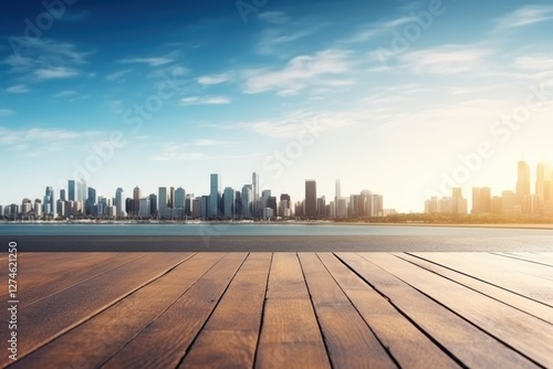 Cityscape view from wooden deck under sunny sky. Urban background. Use for travel, finance ads