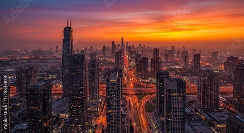Cityscape view shows skyscraper with orange sunset