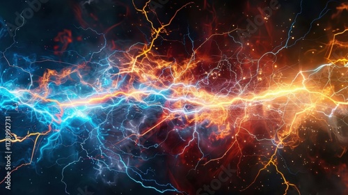 Clashing blue and orange electric energy generates a vibrant big data network, filled with sparks and lightning, set against a dark background brimming with abstract technology
