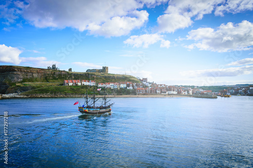 Classic boat on Whitby harbour in Whitby abbey, North Yorkshire, UK.