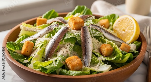 Classic caesar salad presentation with anchovies, croutons, and lemon garnish