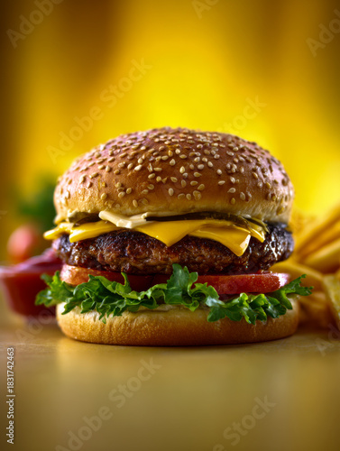 Classic cheeseburger with fresh lettuce, tomato, pickles, melted cheese, and a juicy beef patty served on a sesame seed bun with a side of crispy fries