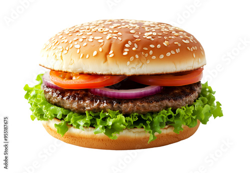 Classic cheeseburger with fresh lettuce, tomatoes, and red onion, isolated on a transparent background. Perfect for fast food promotions, menus, and social media content.