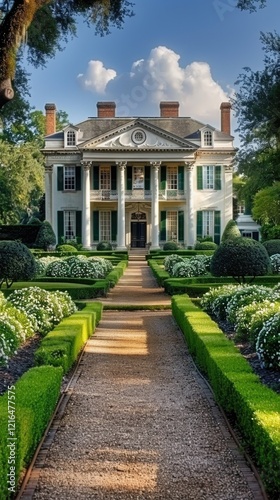 Classic colonial house facade with pathway garden