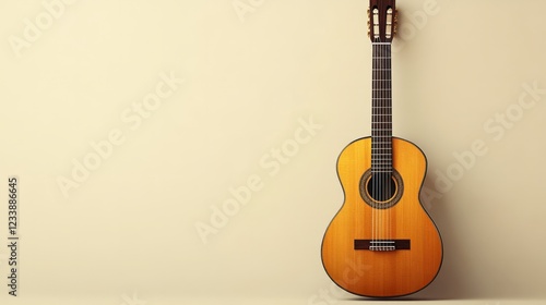 Classic guitar design, natural wood finish, beige background