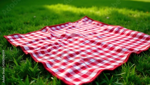Classic red & white gingham picnic blanket on lush green grass , spring, vacation, bright