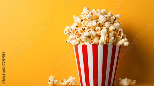 Classic red and white popcorn box on yellow backdrop, ideal for movie-themed design and snack advertising. AI Generative