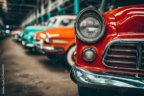 Classic red car leading colorful vintage cars in garage