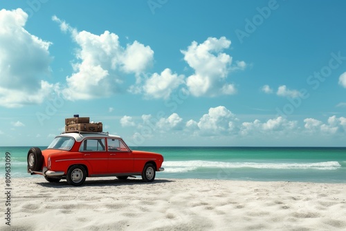 Classic red car with luggage on the roof, parked by a pristine beach under a bright blue sky with clouds