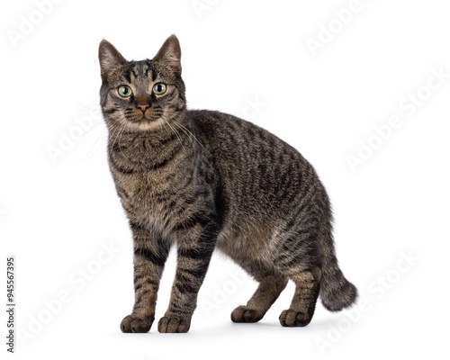 Classic tabby house cat, standing side ways. Looking towards camera. Isolated on a white background.