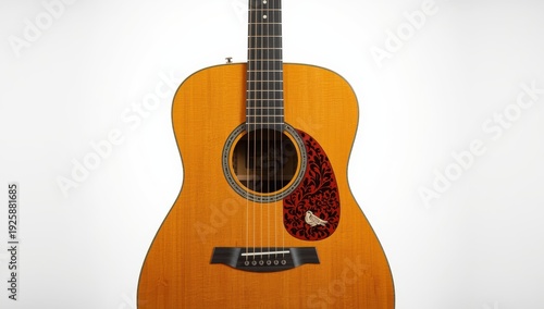 Classic vintage acoustic guitar with floral and bird design, isolated on white