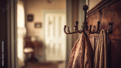 Classic wooden coat rack with ornate metal hooks displays two draped textured fabrics. Cozy home hallway interior bathed in soft warm light.
