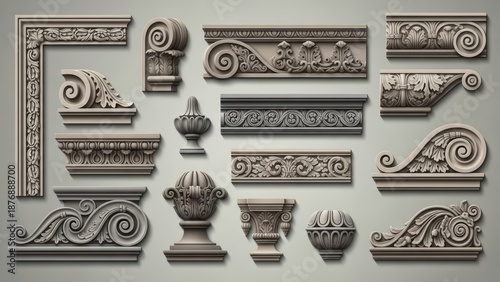 Classical architectural decorative elements set with ornate scroll designs and floral relief carving