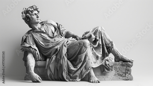 Classical Greek Statue Listening to Music with Modern Headphones in a Unique Blend of History and Technology