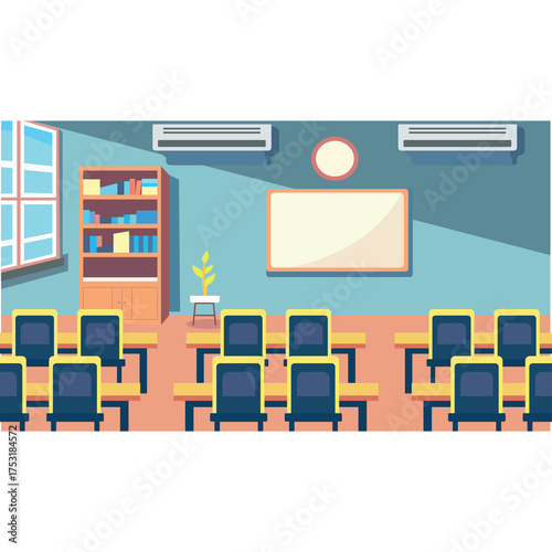 Classroom Interior With Rows Of Empty Desks Air Conditioners Bookshelf And A Whiteboard Ready For Education And Learning