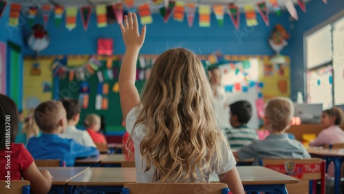Classroom scene, colorful flags hanging, elementary school, child raising hand, long wavy hair, back view, attentive students, bright interior, engaged learning, diverse classroom, teacher at front, c