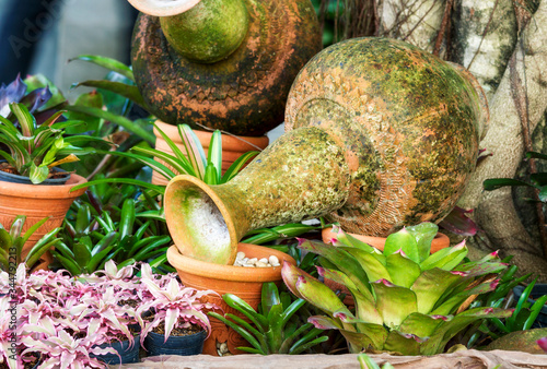 Clay jar of water decorate with colorful bromeliad plants in beautiful garden