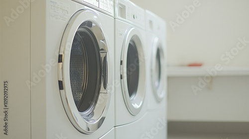 Clean and Efficient Laundry Room: Three modern, sleek washing machines stand side by side in a bright, minimalist laundry room, ready for use. The image evokes a sense of cleanliness and efficiency.