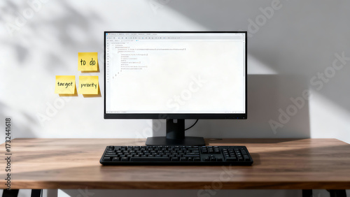 Clean and focused workspace with computer, keyboard, and sticky notes for productivity.