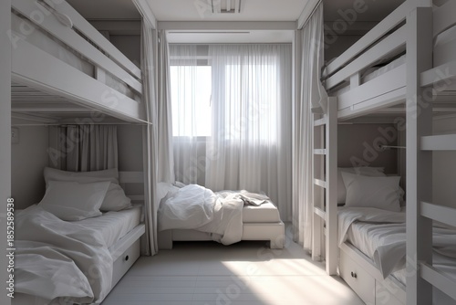 Clean and minimalistic hostel room featuring comfortable bunk beds and natural light in a serene setting
