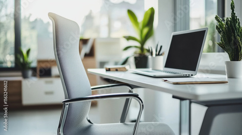 clean and organized home office setup featuring modern desk, ergonomic chair, and laptop surrounded by indoor plants creates productive atmosphere