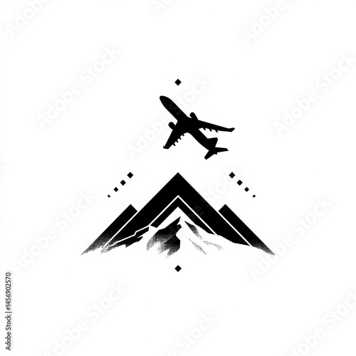 Clean black vector icon of an airplane flying over a simple mountain shape, geometric modern travel logo on white background