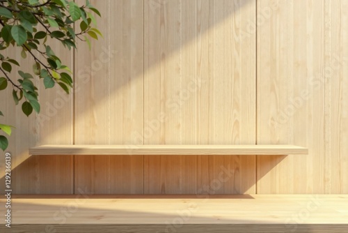 Clean empty shelf against light wood wall, wooden table, presentation, home, minimal