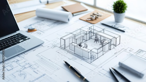 Clean line blueprint of a modular office space, detailed framework and adaptable design