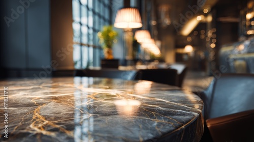 Clean marble tabletop in luxury restaurant interior. Premium blurred background