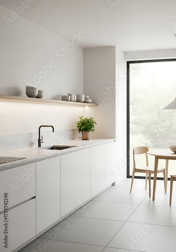 Clean minimalist kitchen design featuring natural light and neutral tones