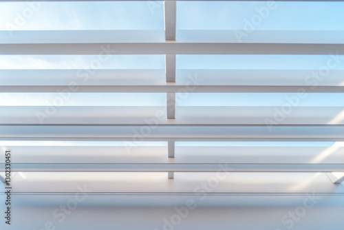 Clean modern architectural ceiling design with clear blue sky viewed from below