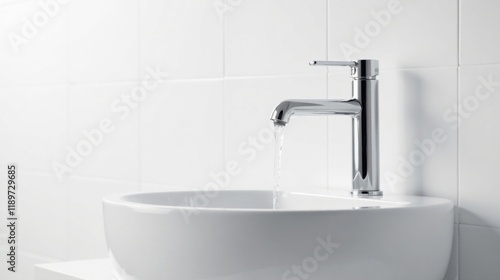Clean modern chrome faucet pouring water into a pristine white basin against a bright tiled backdrop
