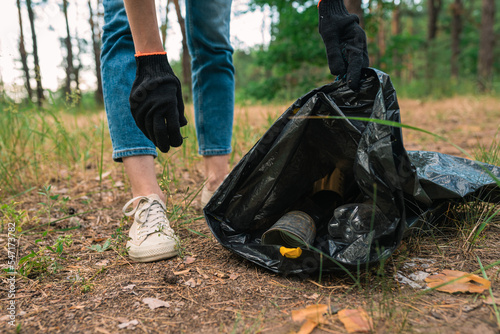 Cleaning plastic in forest. Volunteer collect trash in a trash bag. Plastic pollution and environmental problem concept.