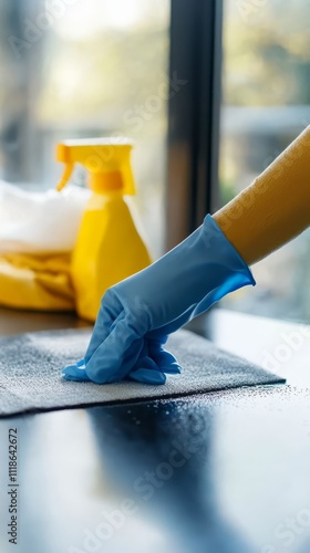 Cleanliness and Care: A gloved hand meticulously wipes down a surface with a cleaning cloth, demonstrating the meticulous care and commitment to hygiene.