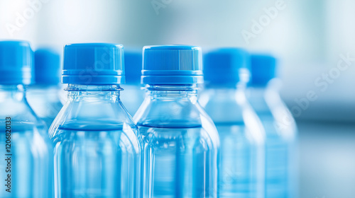 Clear & Refreshing: A row of transparent water bottles with bright blue caps, capturing the essence of pure hydration and a thirst-quenching refreshment. Close up, focus on the bottles' sleek design.