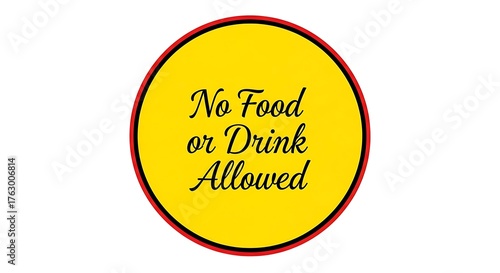 Clear and direct 'No Food or Drink Allowed' warning sign in bold yellow circle with black and red border for essential public notices and safety regulations