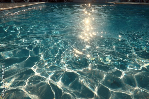 Clear blue swimming pool water reflecting sunlight, creating shimmering patterns on the surface, inviting relaxation and leisure in a tranquil outdoor setting