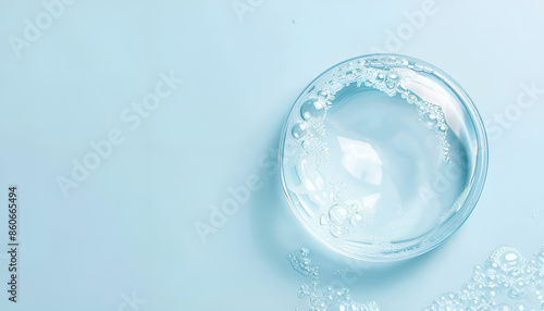 Clear cosmetic gel on light blue background, top view. Space for text