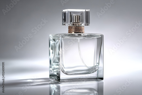Clear cubic perfume bottle with sleek design, reflecting light beautifully, evokes sense of elegance and luxury. minimalist style enhances its visual appeal, making it perfect addition to any