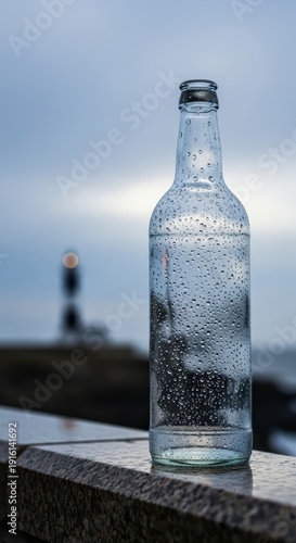 Clear glass bottle with water droplets on stone ledge in overcast coastal setting with blurred lighthouse in background
