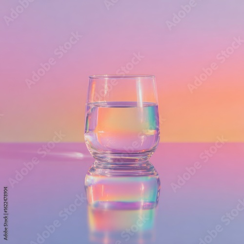 Clear glass of water on a mirrored surface, vibrant pastel background