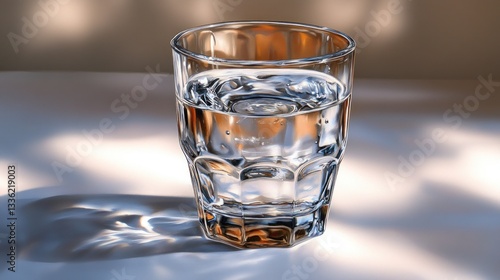 Clear glass of water, sunlight, shadows on white surface, still life image