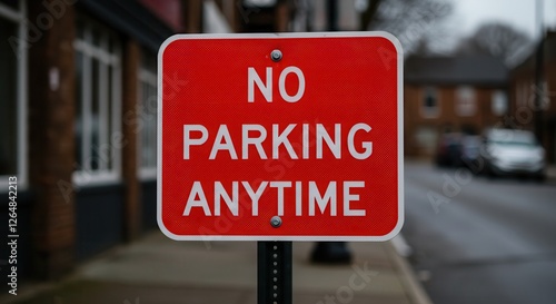 Clear No Parking Anytime Sign in Urban Setting Guiding Driver Behavior
