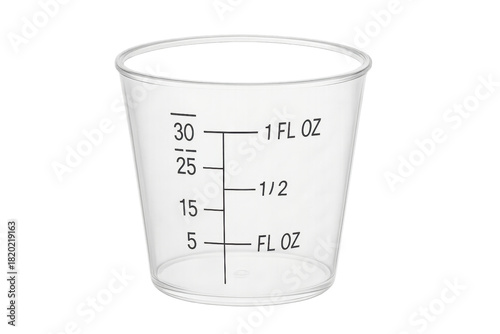 Clear plastic disposable medicine measuring cup showing fluid ounces and milliliters